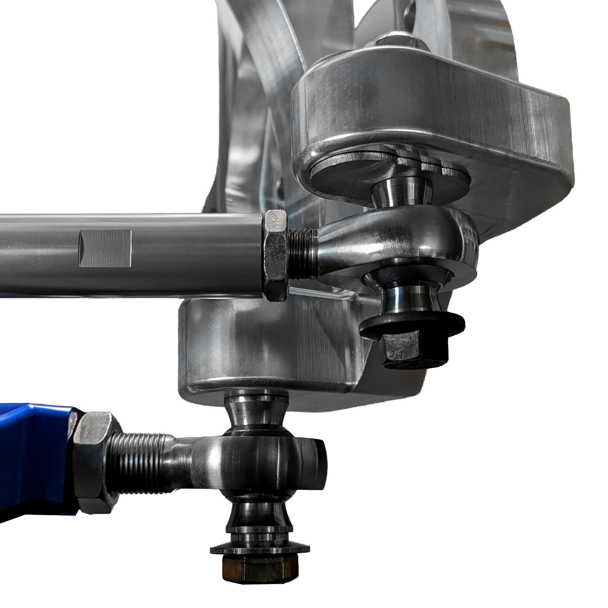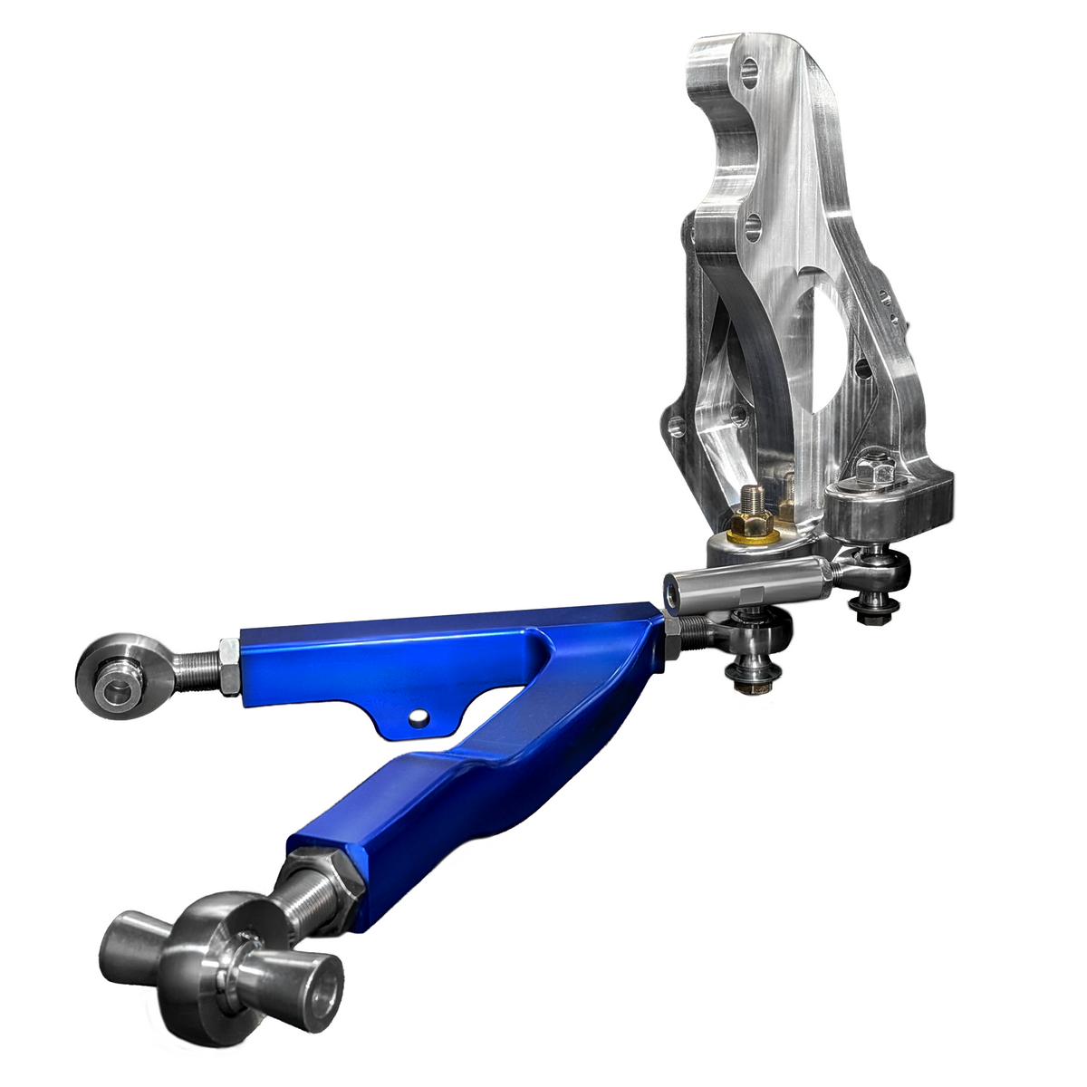 Our control arms are single piece cnc machined billet aluminum and feature a brilliant frost blue anodizing. The arms allow castor and camber adjustment from 5 degrees to 9 degrees, and camber adjustment from 0 degrees to -6 degrees. This versatility offers enough range for any form of motorsports alignment needs. Our design allows for stock to completely lowered ride height and we have designed some curvature on the arm to allow for proper tie-rod clearance when the suspension is at full droop or fully compressed. We don't believe in adding double adjusters on our arms, that would double the costs.