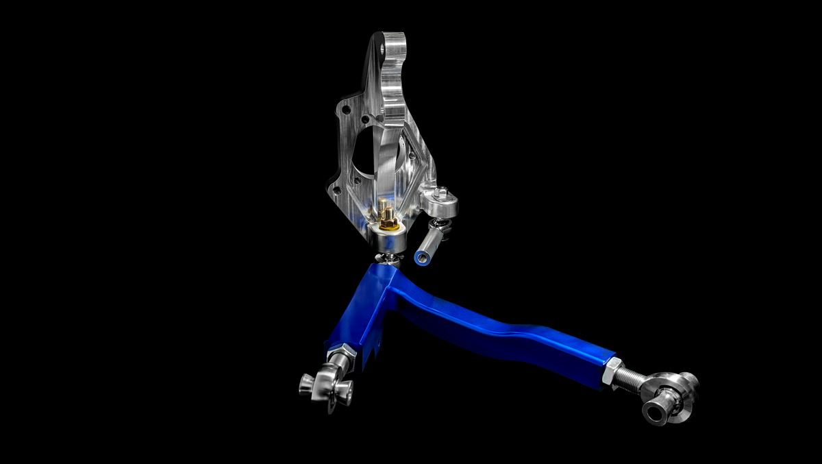 Our control arms are single piece cnc machined billet aluminum and feature a brilliant frost blue anodizing. The arms allow castor and camber adjustment from 5 degrees to 9 degrees, and camber adjustment from 0 degrees to -6 degrees. This versatility offers enough range for any form of motorsports alignment needs. Our design allows for stock to completely lowered ride height and we have designed some curvature on the arm to allow for proper tie-rod clearance when the suspension is at full droop or fully compressed. We don't believe in adding double adjusters on our arms, that would double the costs. Our arms come pre-set with 7 degrees of caster or -3.5 camber for an easy alignment and installation to eliminate the need for double adjusters. We have also engineered new swaybar endlink mounts that eliminate the factory shock mounted unit. Having our control arms with the endlink mounted to them eliminates swaybar binding while steering. Our kit is truly an install it and forget it solution. We do suggest that you use loctite 242 on the hardware and torque check before each use.